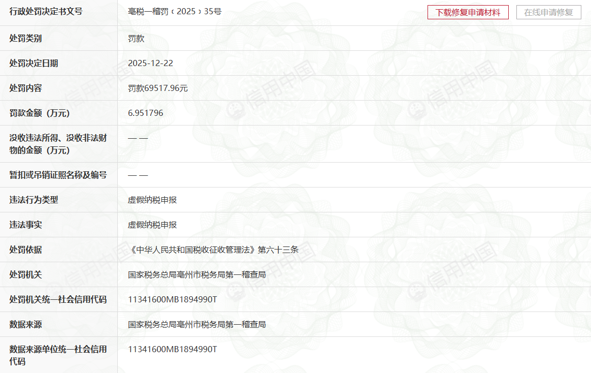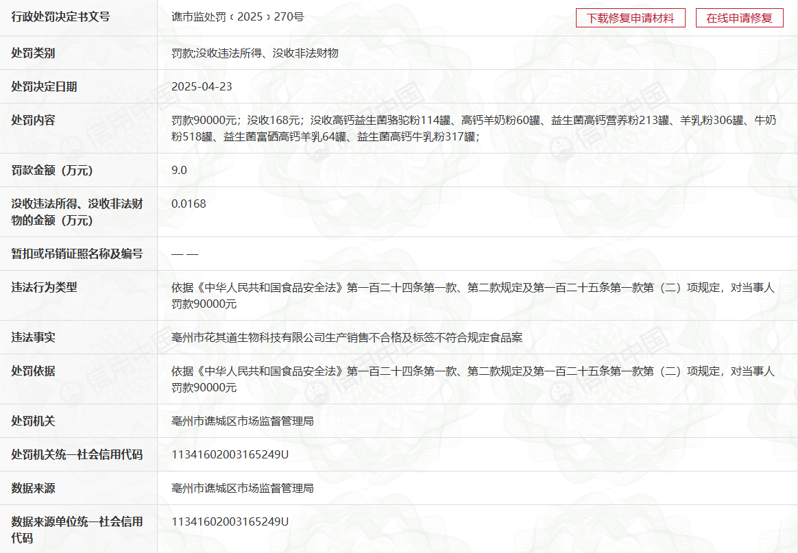 2025年,亳州市花其道生物科技无限公司先后因出产发卖不及格食物、虚假纳税申报问题,年内累计罚款超15。95万元,出企业正在产质量量管控取税务合规层面的双沉缝隙。