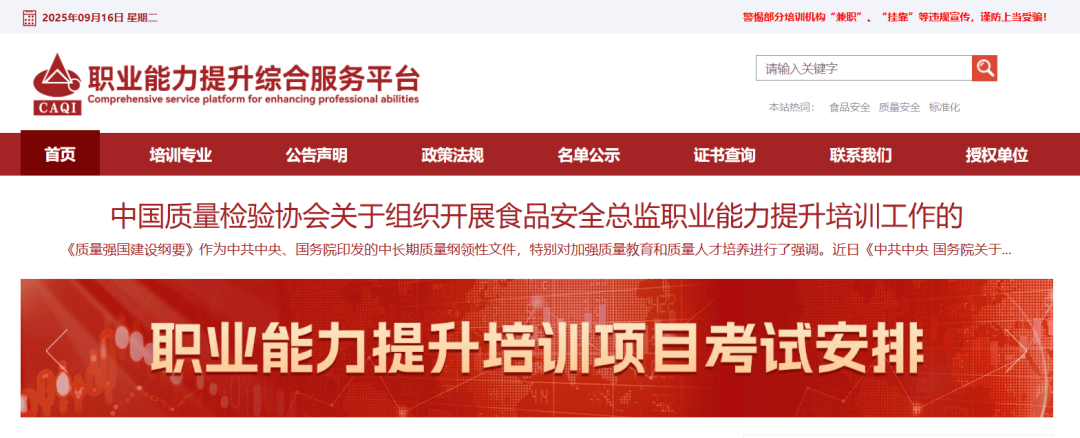 食物出产、加工企业中的高级办理人员和食物平安工做次要担任人,餐饮企业的高级办理人员和食物平安工做次要担任人,企事业单元中食物平安工做次要担任人和分担带领,畅通范畴相关企业的食物平安工做次要担任人,相关从管部分的食物平安监管人员,有志于处置食物平安办理工做的相关专业手艺人员等。培训完成报名且获得授权的进修账号后,可按照本身需要随时登录上述线上培训办事平台进行正在线年第四时度起头,拟正在每个季度的最初一个周六或周日进行培训测验(具体放置以本协会网坐发布通知为准);培训完成对应课程所需需要学时的进修后,按照相关要乞降相关登录上述线上培训办事平台正在时间内进行同一测验。或者百度搜刮“中国质量检 验协会”进入官网。第二步:官网页面下滑点击“职业 能力提拔培训栏目” ,进 入职业能力提拔分析办事平台。第三步:进入《职业能力提拔分析 办事平台》点击进修中 心,进入登录页面输入账 号及暗码,点击登录。中国质量查验协会是由质量查验行业取质量范畴的质量查验手艺机构和专家学者、工做者,相关科研院所、大专院校、学术机构、企事业单元及质量工做取得显著成效的企业取企业担任人,取质量查验相关工做的社会相关人士等志愿结成的、行业性、非营利性社会组织,具有法人资历。中国质量查验协会筹备于1986年,并于1992年正式成立,登记办理机关为平易近政部,行业次要办理部分为国度市场监视办理总局(简称国度市场监管总局),外行业次要办理部分的对口司局为国度市场监管总局质量成长局(牵头对口司局)、国度市场监管总局承认检测司。国度市场监管总局2018年4月组建成立之前,中国质量查验协会历任营业从管部分为原国度质量监视查验检疫总局(简称原国度质检总局)、原国度质量手艺监视局、原国度手艺监视局。