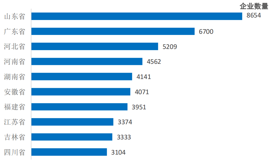 图2-3 2013-2022中国预制菜相关企业注册量 (图表数据来自迈点研究院《2022年中国预制菜财产成长演讲》和艾媒征询《2022年中国预制菜财产成长》)从企业分布的环境来看,目前我国预制菜企业次要集平分布正在山东、广东、江苏等具有生态资本劣势的东部沿海地域以及河南、安徽等保守农业大省。截至2022年12月31日,山东具有预制菜相关企业位居全国第一,达8000余家,占比11。4%。其次是广东,约6700家预制菜相关企业。